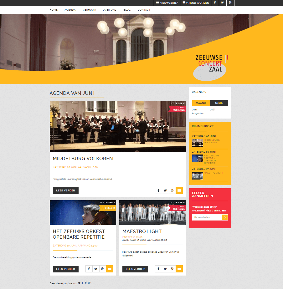 Op de homepage zijn flexibele blokken inzetbaar, bijvoorbeeld om een programma wijziging te communiceren, een hoogtepunt in de agenda onder de aandacht te brengen of ander interessant nieuws te vermelden. Daarmee heeft de Zeeuwse Concertzaal een krachtig communicatiemiddel in handen. Een bezoek aan de Zeeuwse Concertzaal is een must, zowel on- als offline!